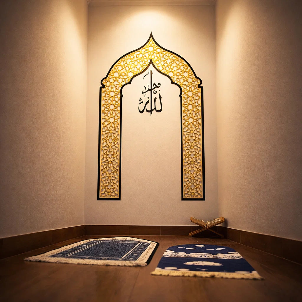 Le temps de prière est une bénédiction qui disparaît peu à peu des foyers. C'est pourquoi nous vous proposons un coin prière raffiné au design islamique luxueux.