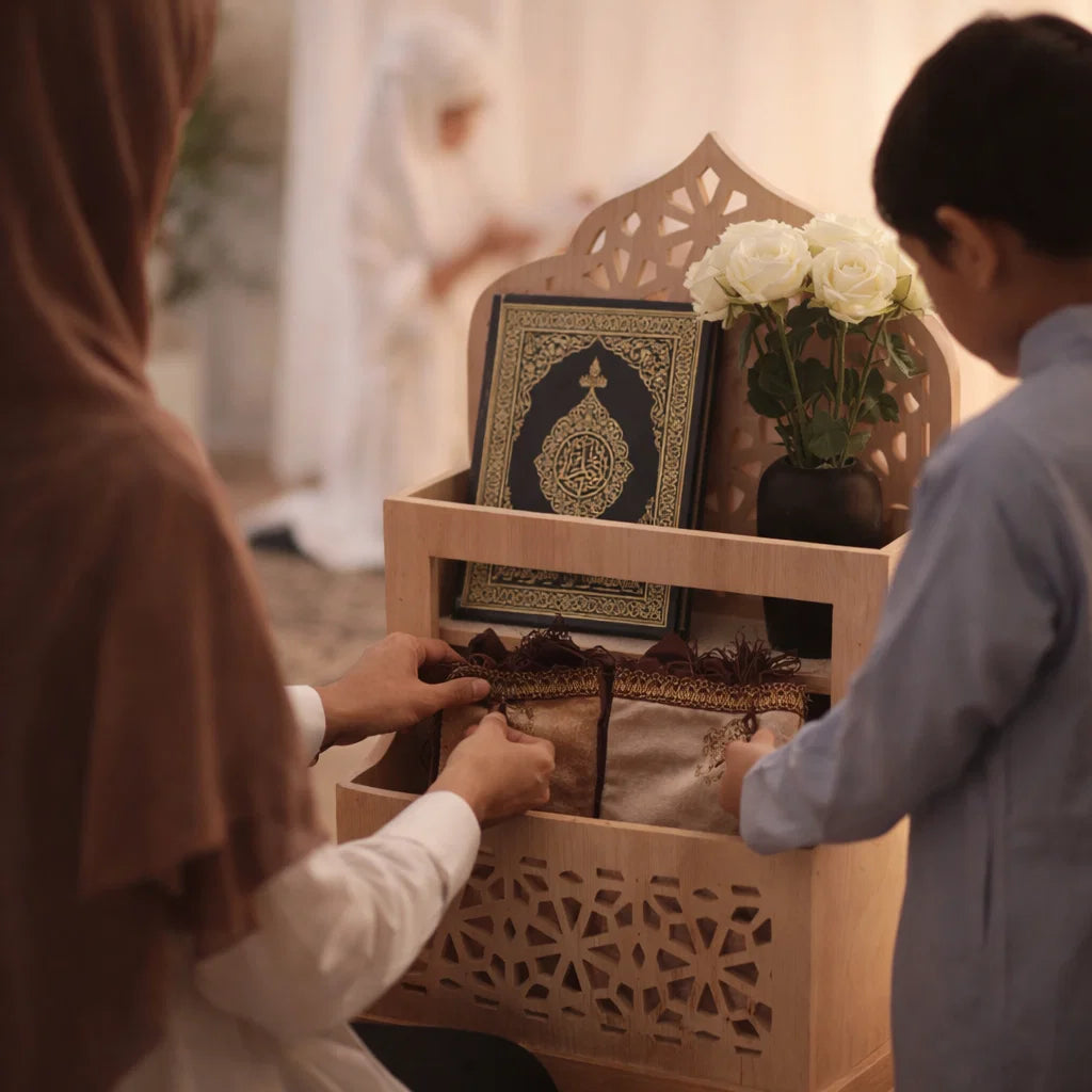 Un organiseur de Coran et un tapis de prière avec une touche décorative élégante